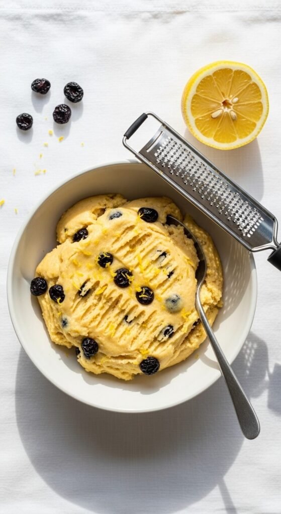 Lemon and blueberry belong together in every form — and cookie dough is no exception. Fresh lemon zest is what makes this recipe sing. Add it directly to the wet ingredients so the citrus oils fully infuse the butter and sugar before the flour goes in. Use heat-treated flour, powdered sugar, softened butter, vanilla, and a splash of fresh lemon juice. Fold in dried blueberries rather than fresh — they hold their shape, don’t add moisture to the dough, and distribute evenly throughout every spoonful.