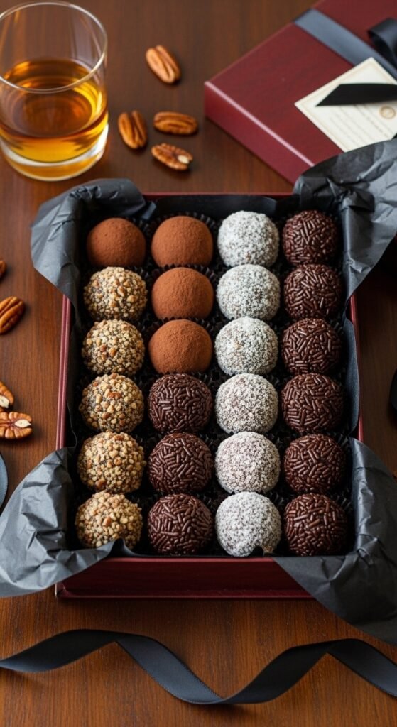 - Small gift boxes lined with parchment or tissue in black, gold, or deep green hold bourbon balls elegantly in a single layer