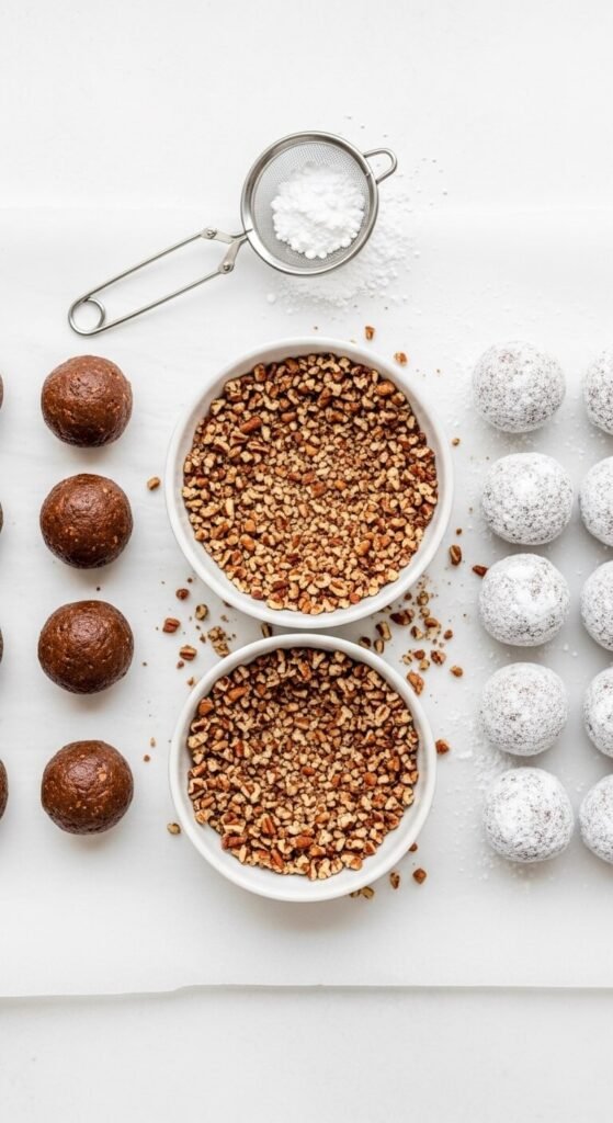 For a multi-coating gift box: Roll a third of the balls in each coating. The visual contrast of powdered sugar white, cocoa brown, and pecan gold makes the finished box look like it came from a professional confectionery.