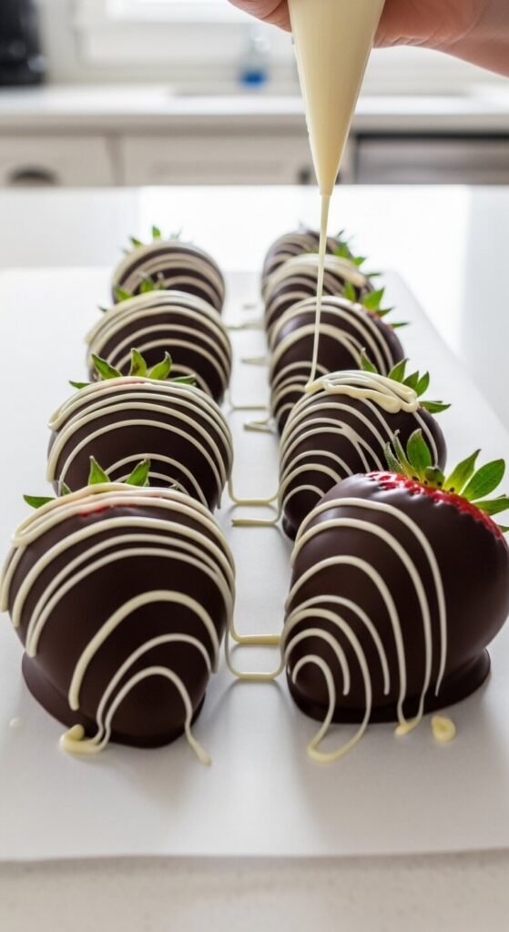 The professional trick: Drag the bottom of the strawberry lightly across the lip of the bowl as you remove it. This removes the excess drip at the base and gives you that clean, sharp chocolate edge that screams made by someone who knows what they’re doing.