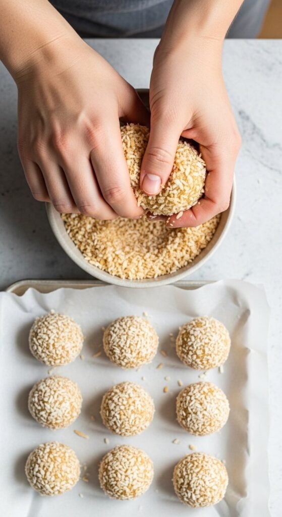 For toasted coconut coating: Spread the rolling coconut in a dry skillet over medium heat and stir constantly for 3 to 4 minutes until golden and fragrant. Let cool completely before rolling the balls in it. Toasted coconut adds a deeper, nuttier flavor dimension that makes the finished balls taste considerably more complex than their ingredient list suggests.