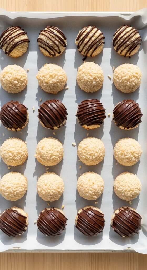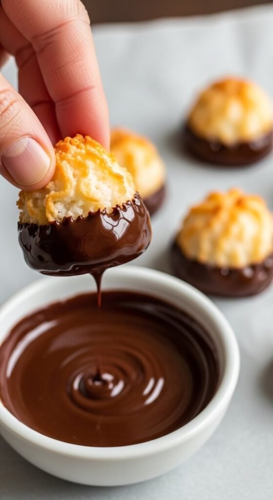 A no-bake coconut macaroon dipped in dark chocolate is genuinely one of the best simple dessert experiences available. The slightly sweet, chewy coconut against the firm, slightly bitter chocolate shell is a combination that works on every level.