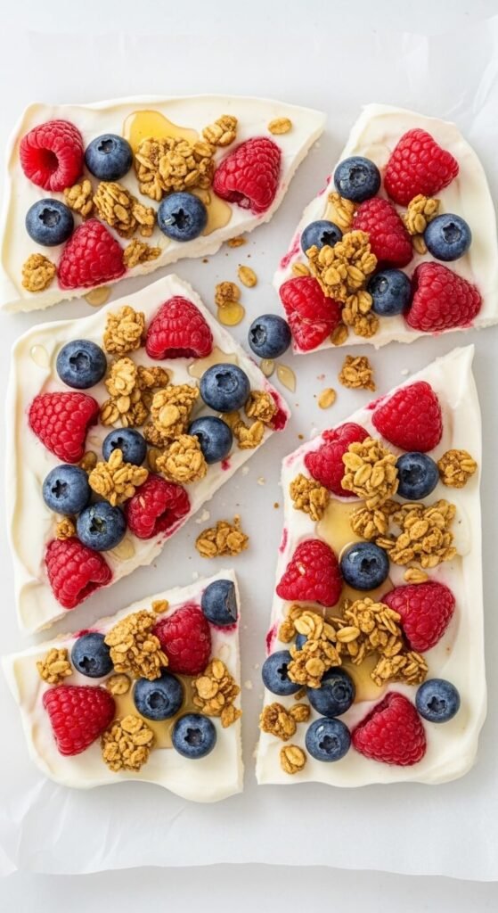 Frozen yogurt bark is the fastest freezer dessert on this list and one of the most visually impressive. It requires no equipment beyond a baking sheet and a freezer.