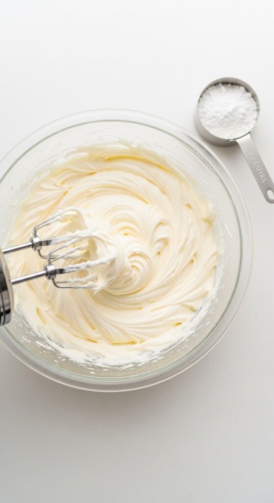 Room temperature cream cheese is everything here. Cold cream cheese will not beat smooth — you’ll end up with lumps that freeze into unpleasant little pockets. Take it out of the fridge at least an hour before you start.