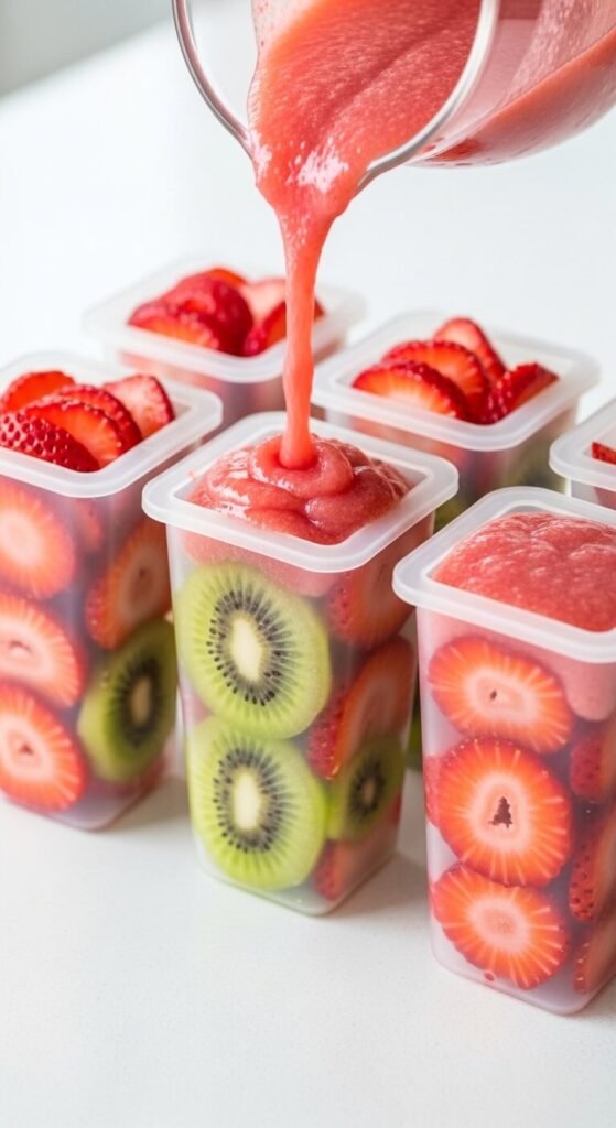 - Pour or ladle the blended fruit base into each mold, leaving about ¼ inch of space at the top (the mixture expands slightly as it freezes).