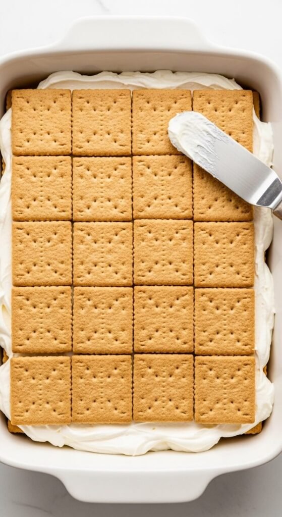 The critical detail: Press each cracker layer gently but firmly into the cream beneath it before adding the next cream layer. This eliminates air pockets and ensures the crackers make full contact with the moisture they need to soften properly overnight.