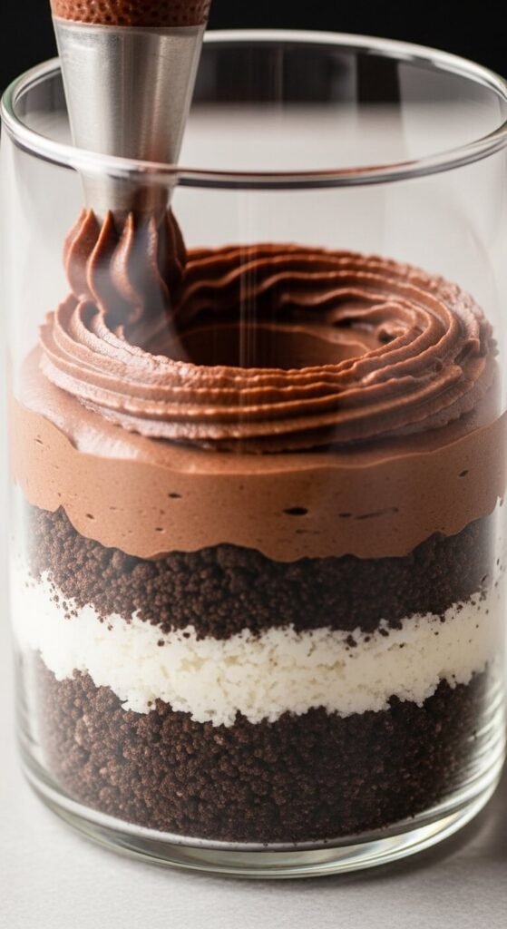 Repeat these layers — base, cream, finish, base, cream, finish — as many times as your vessel allows. Three to four complete repetitions in a tall glass creates that dramatic, multi-layered visual that makes the dessert genuinely showstopping.