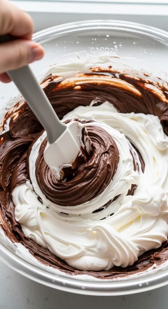 Stop as soon as the two mixtures are just combined — a few faint white streaks are acceptable and will disappear during chilling. Over-folding deflates the cream just as much as mixing does.