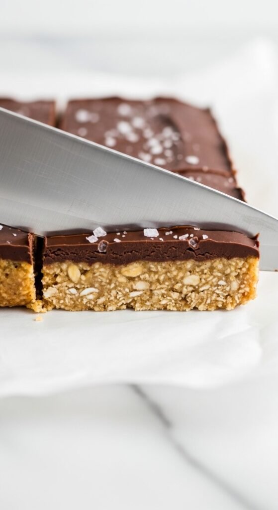 Option 1 — Refrigerator: Chill for a minimum of 2 hours. The chocolate will be fully set and the oat base will be firm throughout. This is the safest method for consistently clean cuts.