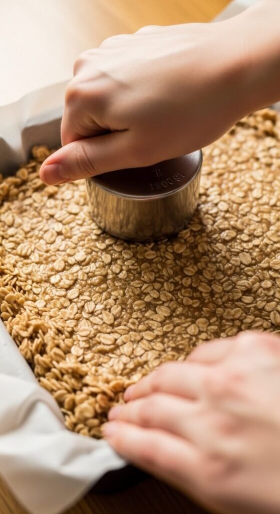 Transfer the mixture to the pan. Use your hands first to distribute it roughly evenly. Then take the flat bottom of a measuring cup and press with firm, deliberate pressure across the entire surface — working from the center outward and then back again. Pay special attention to the corners and edges, which tend to be looser than the center.