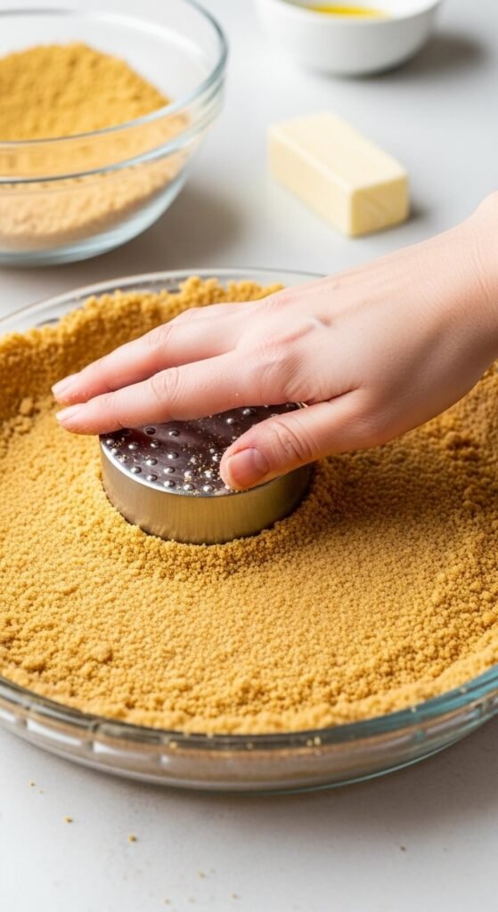 Tip: Press firmly and consistently. A loosely packed crust crumbles when sliced. The 30-minute chill is non-negotiable — skip it and the crust will disintegrate into the filling.