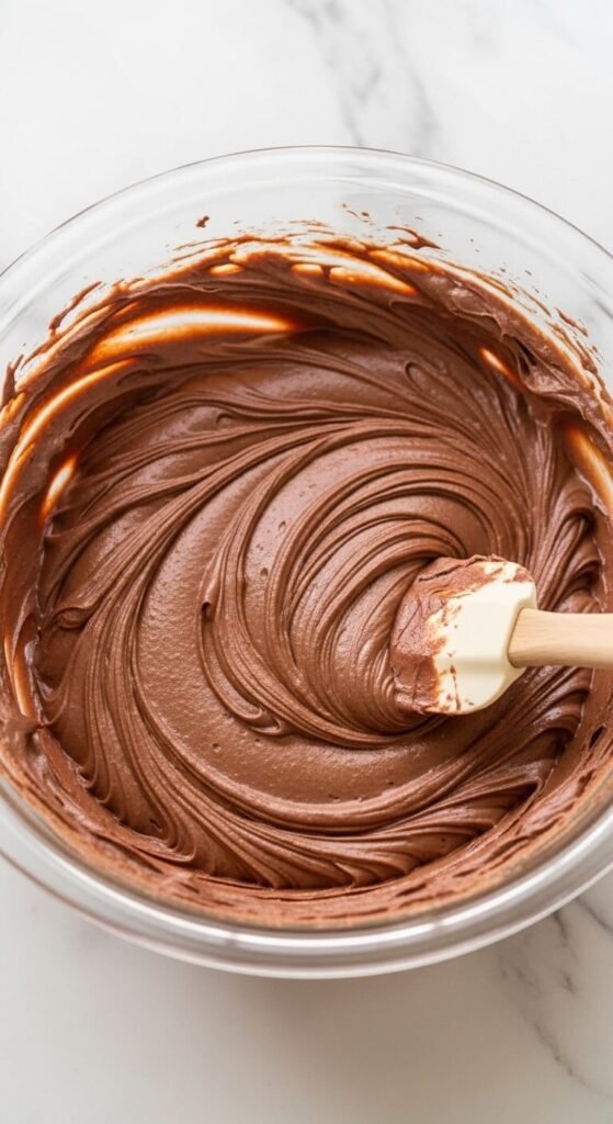 This creates a simple ganache. Let it cool for ten minutes until it is warm but not hot before adding it to the cream cheese mixture — pouring hot chocolate into cream cheese scrambles the dairy proteins and creates a grainy texture.