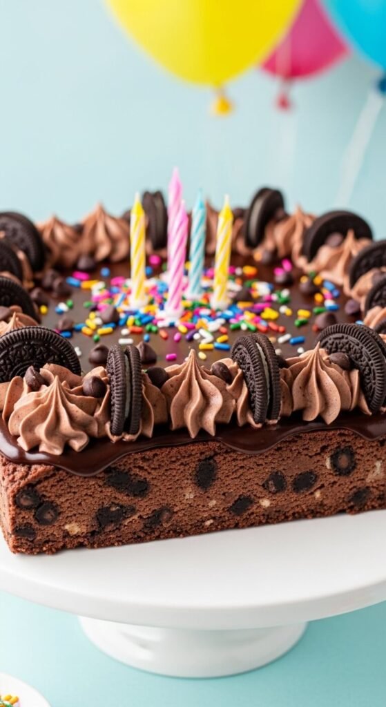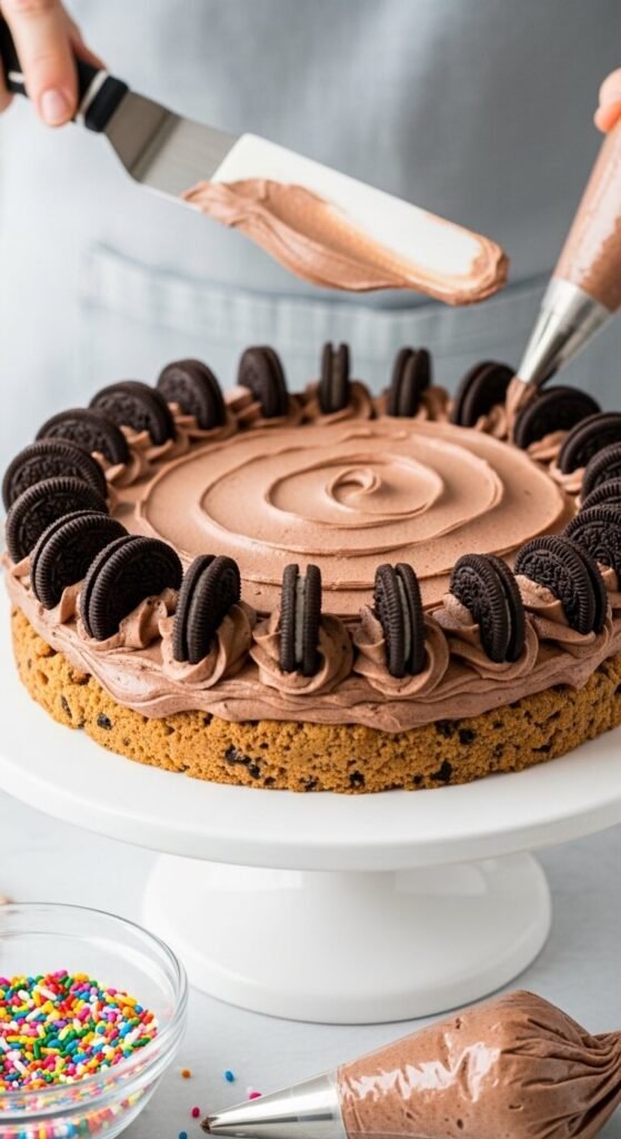 Birthdays deserve something special — but not everyone wants to spend hours measuring, baking, and decorating a layer cake from scratch. Enter the no-bake cookie cake: the dessert that looks like a proper celebration centerpiece, tastes like the best cookie you’ve ever had, and comes together without turning on the oven once. It’s thick, rich, deeply chocolatey, loaded with cookie pieces, and topped with the kind of frosting swirls that make people reach for their phones before they reach for a fork. Whether it’s for a child’s birthday, a casual gathering, or any occasion that calls for something a little extraordinary without the stress — this is the recipe to have in your back pocket.