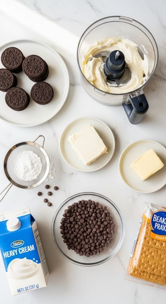 Step 4 — Fold in the cookie crumbs and chips Add the Oreo crumbs, graham cracker crumbs, and mini chocolate chips all at once. Fold with a spatula until completely combined — the mixture will be thick, almost dough-like, and smell extraordinarily good.