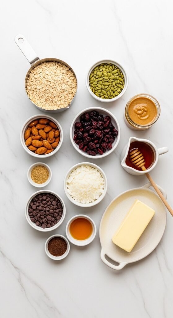 The binder ratio rule: For every 4 cups of dry ingredients, you need approximately ¾ to 1 cup of combined binder — the nut butter, honey, and butter together. Below this ratio, the bars crumble. Above it, they’re too sticky and soft to hold their shape.