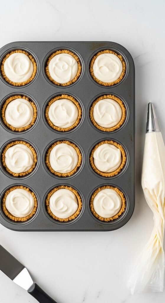 Fill the cups: Spoon or pipe the filling evenly into each chilled crust-lined cup, filling to about ¼ inch below the top of the liner. Smooth the tops with a small offset spatula or the back of a spoon.