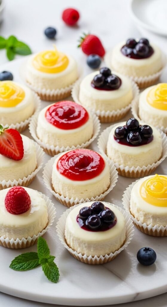 Making each mini cheesecake slightly different is part of the fun — and it makes a platter of twelve look like an artisan dessert board.