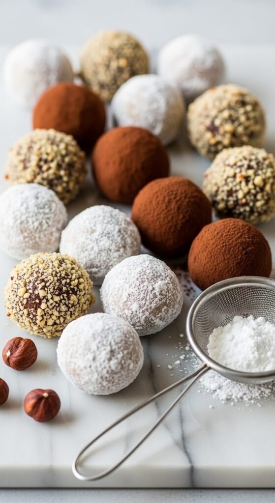 - Powdered sugar — classic, clean, and gives them an elegant truffle-like appearance.
