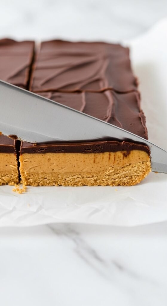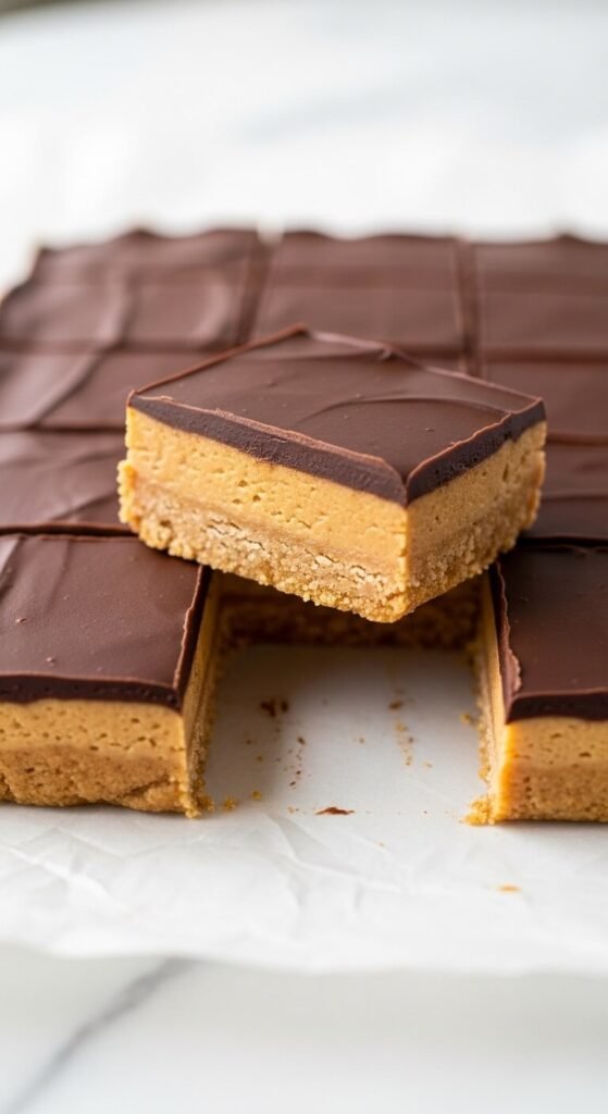 Most peanut butter bars taste like peanut butter and chocolate — which is good, but not quite the same thing. The Reese’s flavor comes from something specific: powdered sugar in the peanut butter layer and a particular ratio of butter to peanut butter that produces a slightly dense, almost crumbly texture rather than a soft, fudgy one.