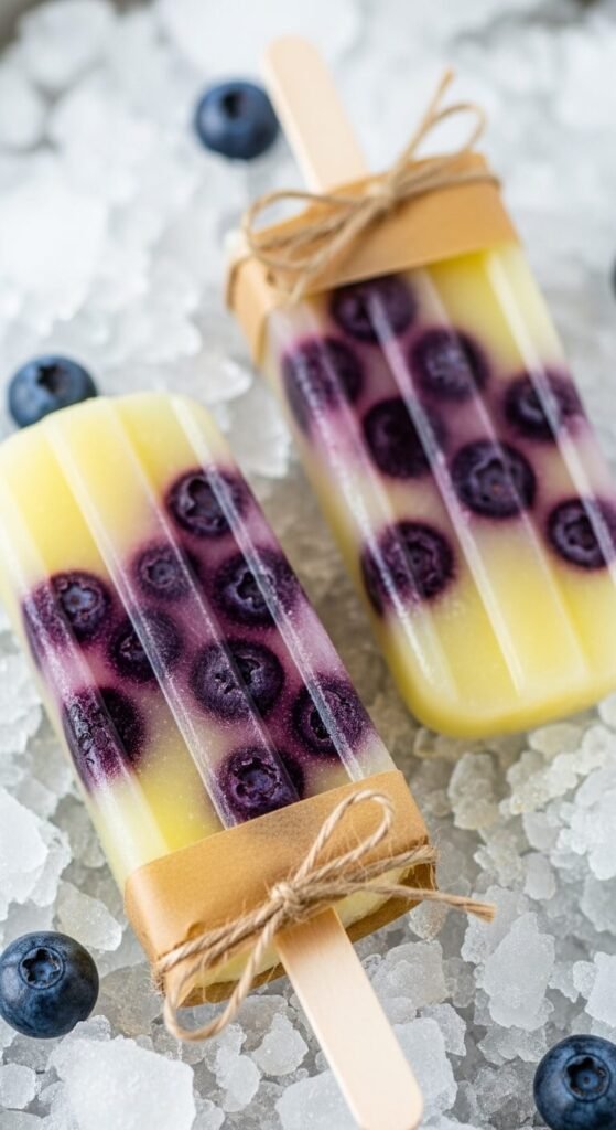 No blending required for this one. Simply muddle or lightly mash the blueberries with a fork — you want them broken down but not completely pureed. Stir in the lemonade and pour into molds. The blueberry pieces suspend beautifully in the frozen lemonade, creating a gorgeous speckled effect.