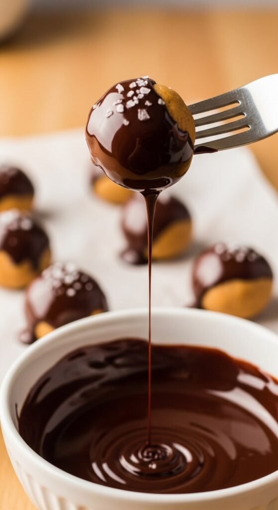 Freeze for 20 minutes before dipping. Not refrigerate — freeze. A partially frozen filling ball stays firmly on the dipping fork, sets the chocolate coating almost instantly on contact, and produces a clean, crack-free shell. Refrigerator-cold balls work but frozen balls work significantly better.
