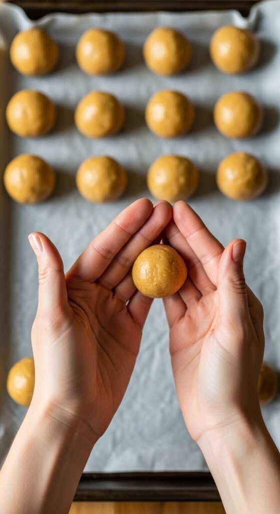 Use a tablespoon-sized cookie scoop for uniform portions. Roll each between your palms quickly — the goal is a smooth sphere before the warmth of your hands begins softening the surface.