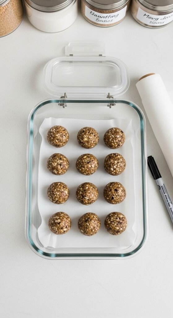 Round, bite-sized no-bake treats are the easiest category to store well — and the easiest to ruin by not thinking about surface contact.